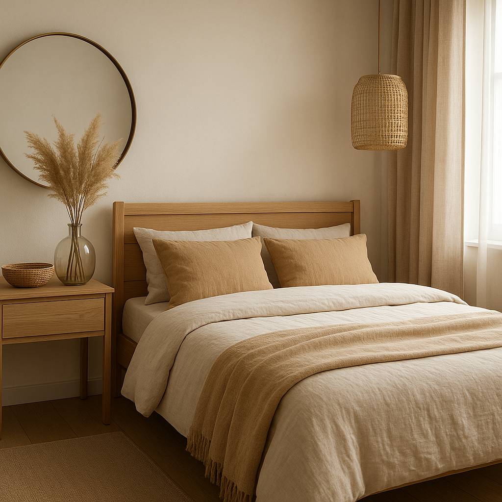 Comment éviter l’effet froid dans une chambre naturelle ? Ajoutez du bois, un tapis, un plaid en laine et une lumière chaude. Les textiles naturels chambre jouent ici un rôle clé : ils réchauffent visuellement et absorbent la rigidité des surfaces trop lisses.